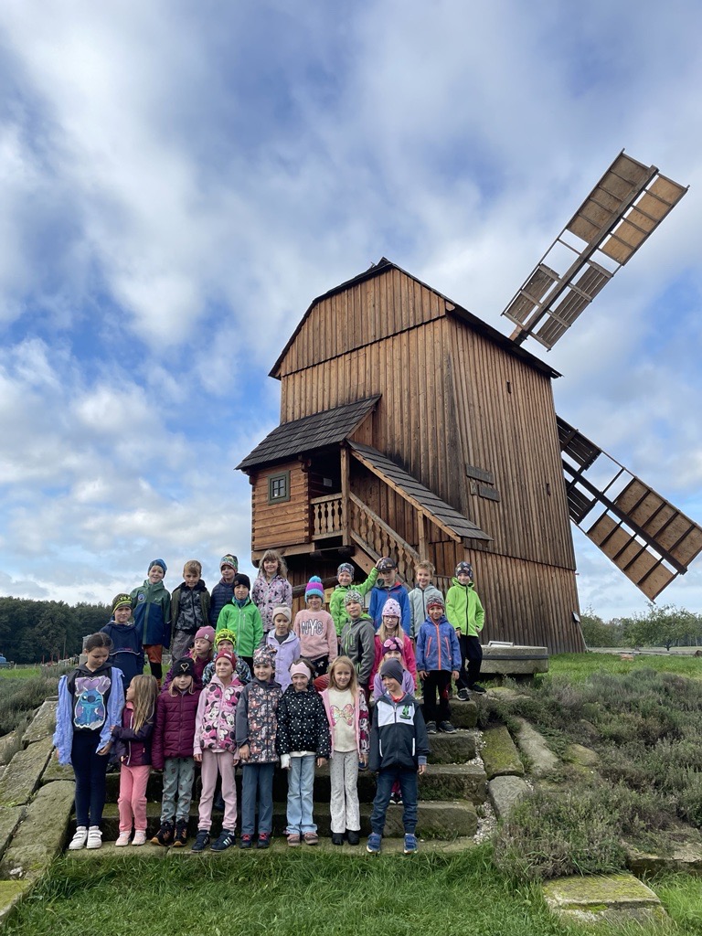 Zde jsme si mohli prohlédnout s průvodkyní celý skanzen, dozvěděli jsme se mnoho informací o životě na vesnici v dřívějších dobách a poznali jsme mnohé pomůcky, nástroje a věci, které již dnes neznáme a nepoužíváme. Děti se také zúčastnily tvořivých programů, vyráběly mýdla, pracovaly s ovčí vlnou a z drátků a korálků vyráběly vážku.