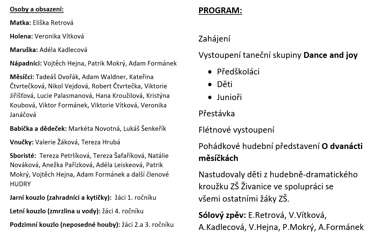 Dne 18.12. proběhlo dlouho připravované vánoční vystoupení pro rodiče a veřejnost, konané v sokolovně v Živanicích. Letos se hlavního úkolu ujal hudebně - dramatický kroužek naší školy, který nastudoval tak trochu muzikálovou úpravu pohádky O dvanácti měsíčkách na motivy díla Z.Svěráka a J.Uhlíře. Do společného díla jsme jako obvykle zapojili i ostatní žáky školy, kteří představovali různá roční období. Letos nás nácviky moc bavily, děti se také aktivně zapojovaly do tvorby scénáře a na vystoupení jsme se moc těšili. Letošní novinkou bylo také propojení našeho vystoupení s vystoupením tanečního kroužku Dance and joy. Děvčata ve 3 věkových kategoriích tak zahájila vystoupení krásnými tanečními choreografiemi. Nesmíme zapomenout ani na muzikanty, zahráli nám mladší i starší flétnisté a překvapením bylo jistě vystoupení malého harmonikáře.